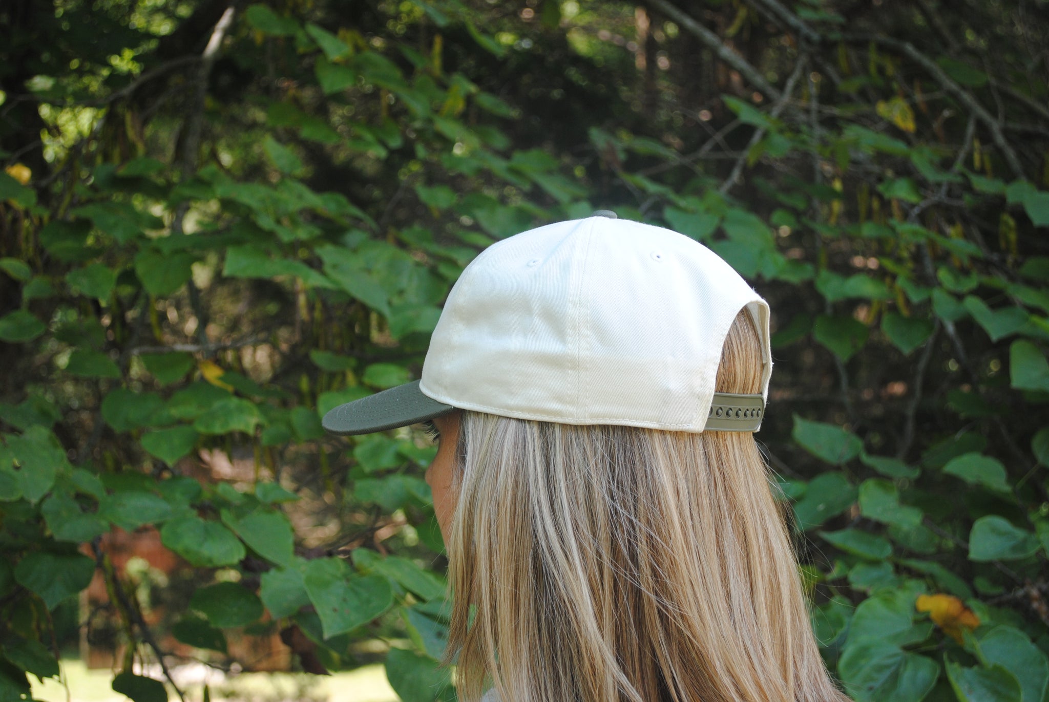 White and green canvas hat with Saturday In The Park logo embroidered on the front.