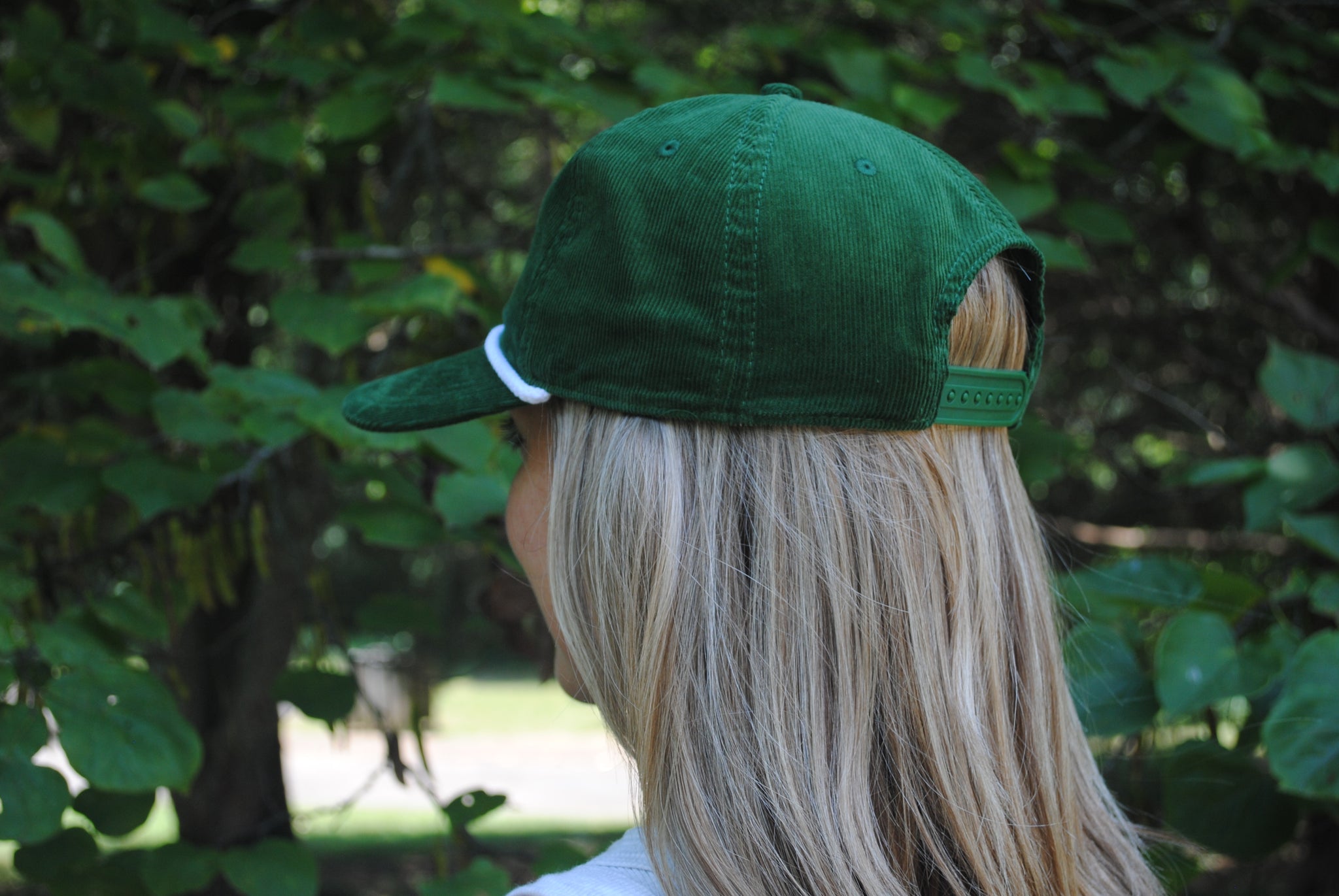 Emerald green corduroy hat with Saturday In The Park logo embroidered on the front.
