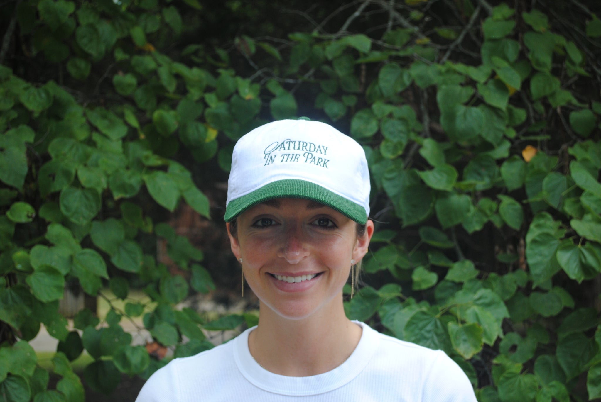 White and emerald green corduroy hat with Saturday In The Park logo embroidered on the front.